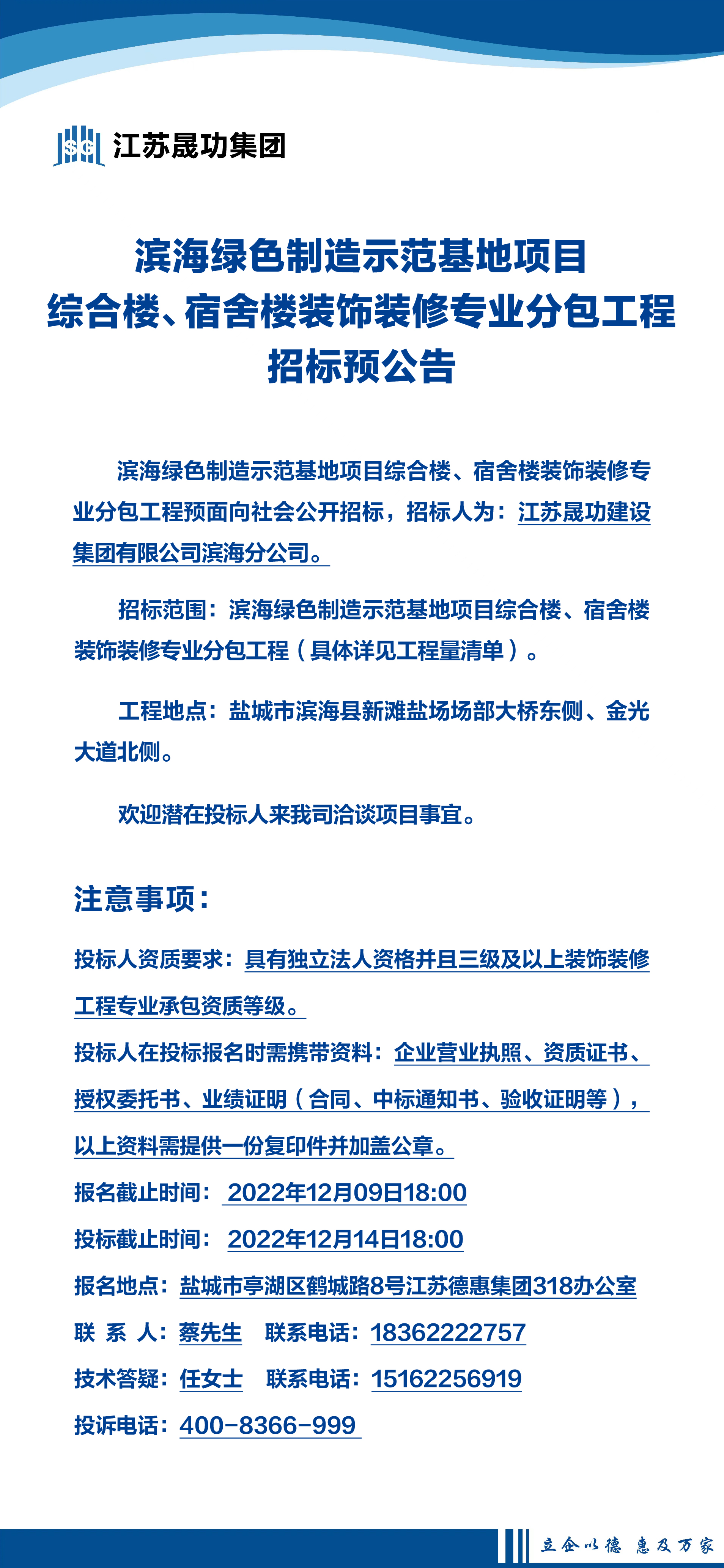 濱海綠色制造示范基地綜合樓、宿舍樓裝飾裝修專業(yè)分包工程