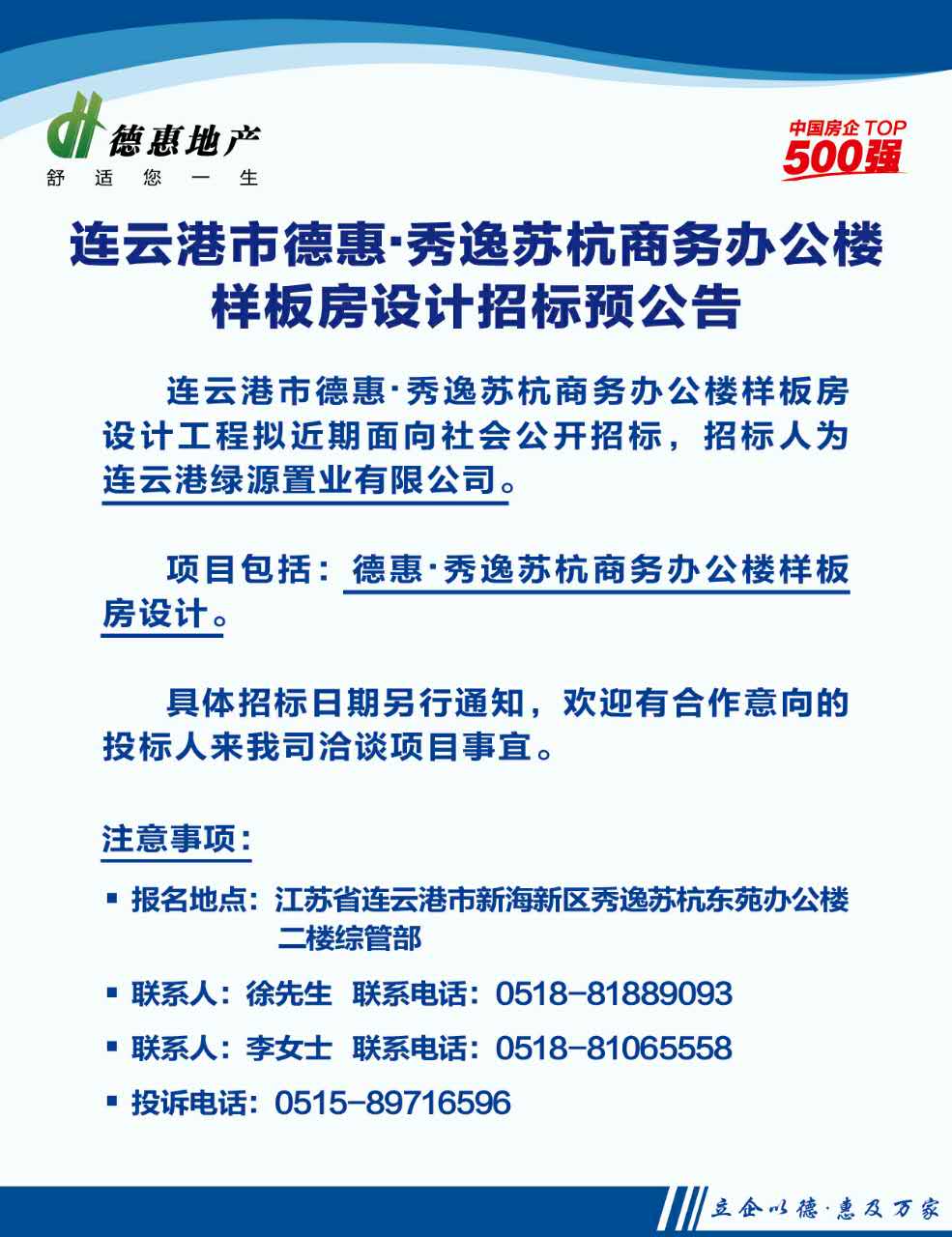 連云港德惠·秀逸蘇杭商務(wù)辦公樓樣板房設(shè)計(jì)招標(biāo)預(yù)公告