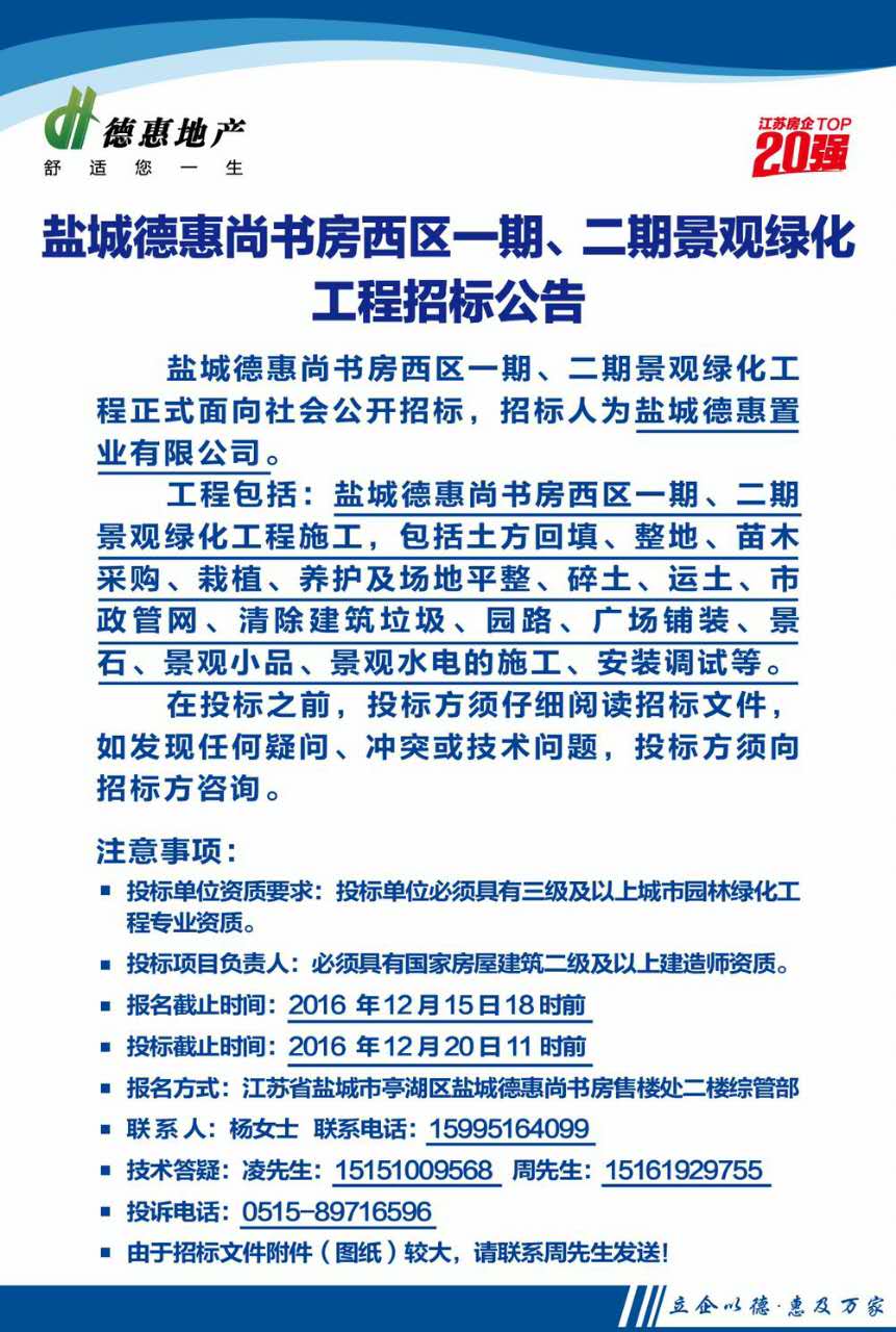 鹽城德惠尚書房西區(qū)一期、二期景觀綠化工程招標(biāo)公告