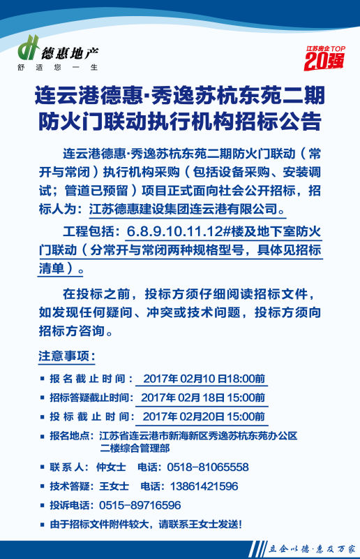連云港秀逸蘇杭東苑二期防火門(mén)聯(lián)動(dòng)執(zhí)行機(jī)構(gòu)招標(biāo)公告及文件