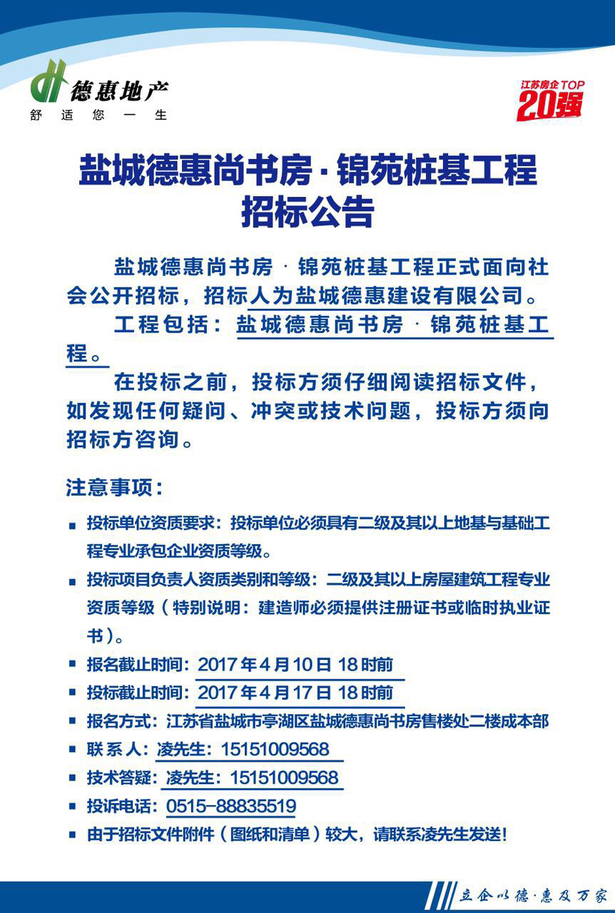 鹽城德惠尚書房•錦苑樁基工程招標(biāo)公告