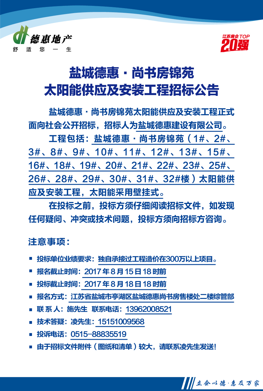 鹽城德惠•尚書房錦苑太陽能供應(yīng)及安裝工程招標(biāo)公告