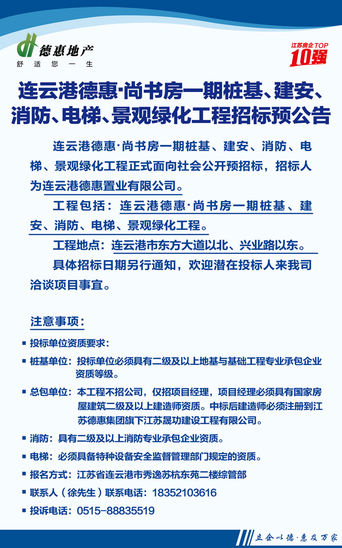 連云港德惠·尚書房一期樁基、建安、消防、電梯、景觀綠化工程招標(biāo)預(yù)公告