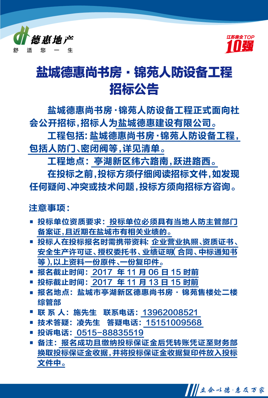鹽城德惠尚書房·錦苑人防設備工程招標公告