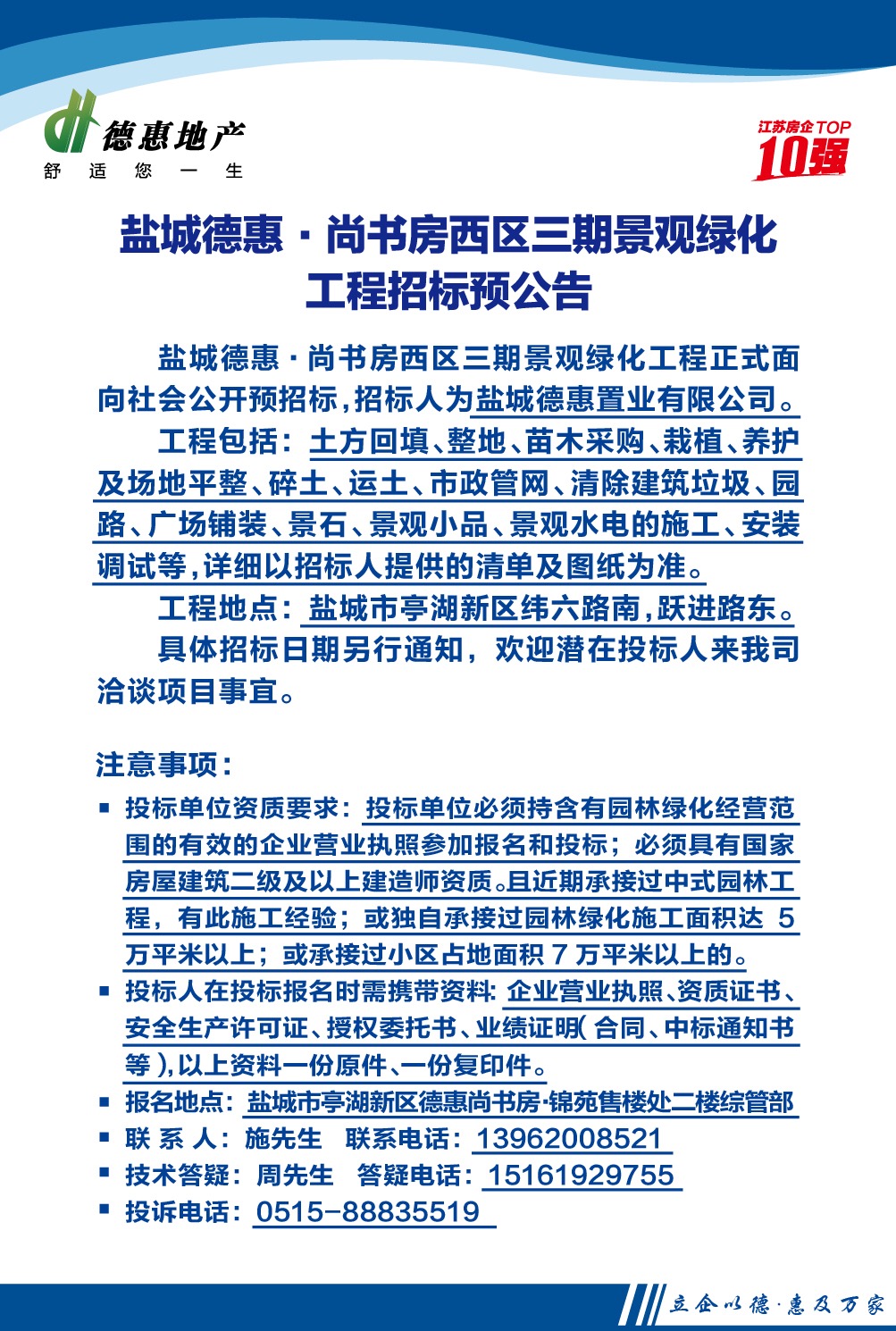 鹽城德惠·尚書房西區(qū)三期景觀綠化工程招標預公告