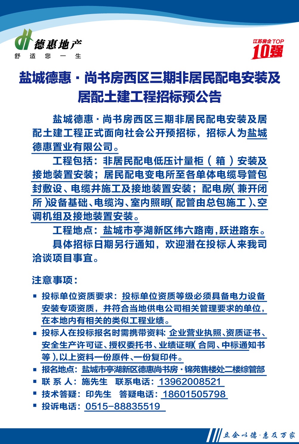 鹽城德惠·尚書房西區(qū)三期非居民配電安裝及居配土建工程招標(biāo)預(yù)公告