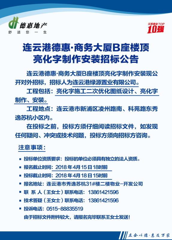 連云港德惠·商務(wù)大廈樓頂亮化字制作安裝招標(biāo)公告