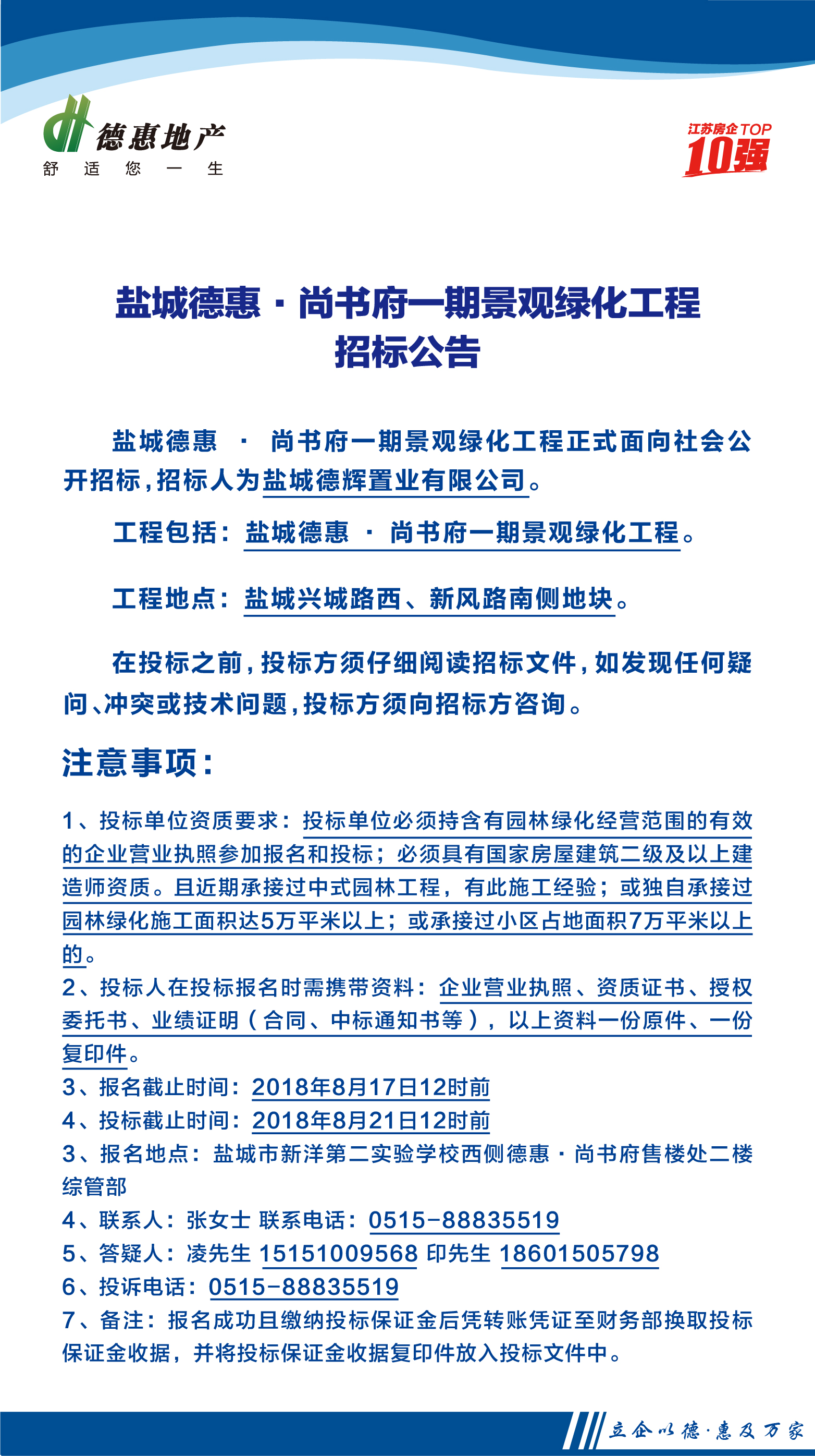 鹽城德惠·尚書府一期景觀綠化工程招標(biāo)公告