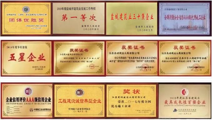 晟功建設(shè)集團(tuán)立足江蘇,面向全國(guó),承建六百余項(xiàng)工程,相繼榮獲“揚(yáng)子杯”、“玉女峰杯”、“鹽阜杯”等百余項(xiàng)榮譽(yù)。自成立以來,集團(tuán)連續(xù)多年在全省免交農(nóng)民工工資保證金,被評(píng)為“全國(guó)企業(yè)社會(huì)信用評(píng)價(jià)AAA級(jí)信用企業(yè)”、“全國(guó)優(yōu)秀施工企業(yè)”、“工程建設(shè)誠(chéng)信典型企業(yè)”、“江蘇省最具成長(zhǎng)性百?gòu)?qiáng)企業(yè)”、“鹽城市建筑業(yè)發(fā)展工作先進(jìn)企業(yè)”,連續(xù)四年獲得了鹽城市“爭(zhēng)星創(chuàng)優(yōu)”星級(jí)企業(yè),名列2019年度鹽城市建筑業(yè)發(fā)展考核“第一等次”、“鹽城市建筑業(yè)30強(qiáng)”,2020年獲得江蘇省建筑產(chǎn)業(yè)現(xiàn)代化創(chuàng)新聯(lián)盟年度突出貢獻(xiàn)單位。