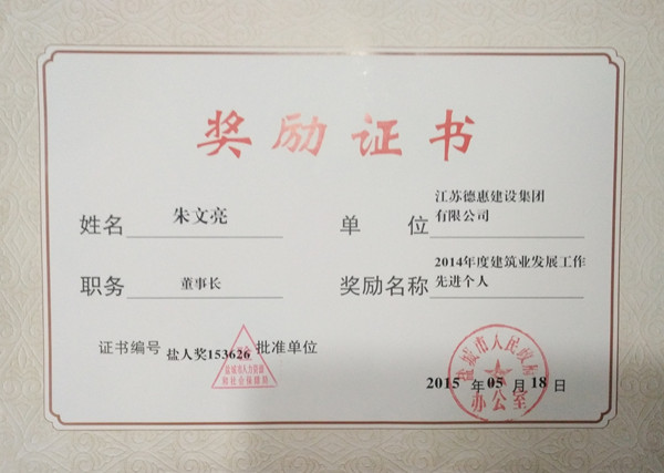 在2014年度鹽城市建筑業(yè)發(fā)展工作考核評選中,我集團朱文亮董事長因其在建筑業(yè)的突出業(yè)績,榮獲“2014年度建筑業(yè)發(fā)展工作先進個人”稱號。 市人民政府領導表示,希望全市建筑業(yè)廣大干部職工以先進為榜樣,以更加昂揚的斗志、更加勤勉的作風,加快建筑業(yè)轉型升級,推動建筑產業(yè)現代化,進一步推進建筑強市建設,為“建設新鹽城、發(fā)展上臺階”作出新的更大的貢獻。 |