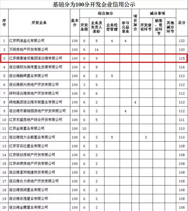 2016年2月17日,連云港市住房局和市社會信用體系建設領導小組辦公室聯合發(fā)文,對連云港市區(qū)開發(fā)經營的269家房地產開發(fā)企業(yè)信用情況進行了考評結果公示。在三年內有預售項目的開發(fā)企業(yè)考評中,江蘇德惠建設集團排名前三。 本次信用考評為連云港市對市區(qū)房地產開發(fā)企業(yè)第一次考評,主要針對開發(fā)企業(yè)2015年度開發(fā)經營的信用情況進行考評。以兩個基礎分值為起點,三年內有預售項目的基礎分為100分,無預售項目的基礎分為90分。在分值構成中,除了基本分,還有加分和減分項。其中,綜合加分包含開發(fā)業(yè)績、企業(yè)及負責人表彰、企業(yè)經營管理、參與公益事業(yè)等;減分事項則根據開發(fā)企業(yè)在樓盤開發(fā)建設、銷售、售后以及其他環(huán)節(jié)的行為進行減分。 注:以上信息摘自連云港房地產網,有刪減,僅供參考。 |