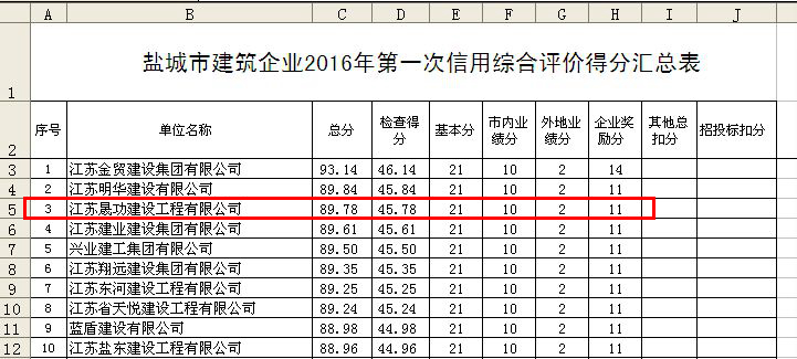 今年鹽城市城鄉(xiāng)建設(shè)局應(yīng)省建設(shè)廳要求對鹽城市內(nèi)已承接工程的建筑企業(yè)(房屋建筑施工總承包)進行了2016年度第一次信用評價,現(xiàn)得分結(jié)果已經(jīng)公示,我集團晟功建設(shè)以總分89.78分名列三甲。