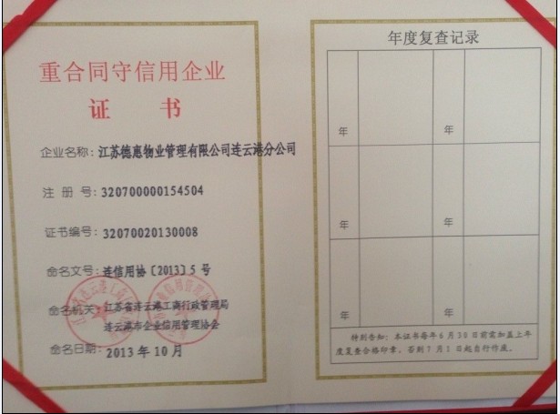熱烈祝賀江蘇德惠物業(yè)管理有限公司連云港分公司榮獲“重合同 守信用企業(yè)”稱號!