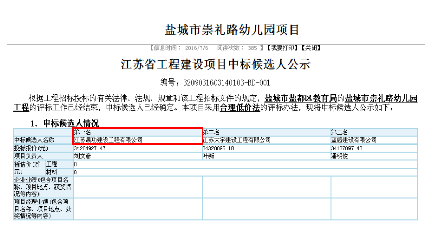 2016年7月6日,鹽城市鹽都區(qū)教育局的鹽城市崇禮路幼兒園項目中標候選人公示,江蘇晟功建設工程有限公司以99.33分的成績位列第一名,7月12日中標公示結果公布,晟功公司成功中標。