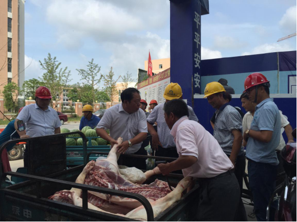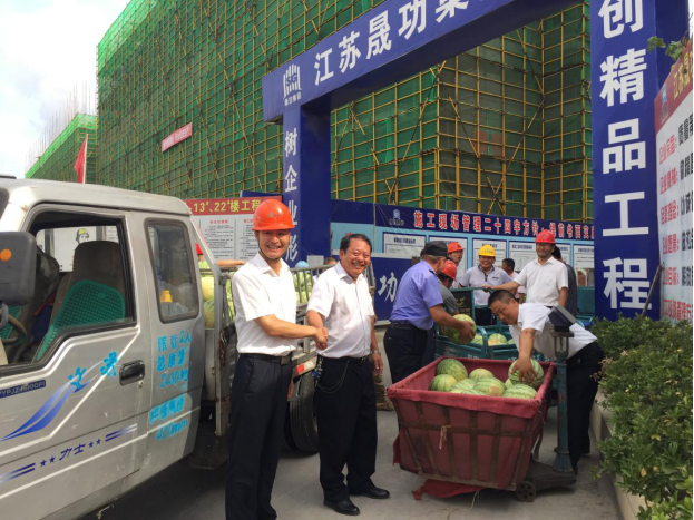 烈日炎炎,高溫持續(xù)。2016年8月4日,德惠集團(tuán)領(lǐng)導(dǎo)一行來(lái)到德惠· 尚書府項(xiàng)目施工現(xiàn)場(chǎng),慰問(wèn)工作在一線的員工們,并為他們送來(lái)了350多斤豬肉、3000多斤西瓜、80斤綠豆和40斤白糖。集團(tuán)領(lǐng)導(dǎo)詳細(xì)的了解工人們的生活作息情況,要求各負(fù)責(zé)人充分做好各項(xiàng)防暑降溫工作,保障安全生產(chǎn)。 連日來(lái),阜寧地區(qū)氣溫居高不下,連續(xù)30多度的高溫肆虐著全城。集團(tuán)公司本著“以人為本”的理念,將防暑降溫工作列入重點(diǎn),積極采取有效措施,杜絕因高溫引發(fā)的中暑或其它一切生產(chǎn)安全隱患,確保高溫期間職工的健康與安全。 本次“送清涼”深深激發(fā)了廣大職工的工作熱情,促進(jìn)了集團(tuán)公司的安全生產(chǎn),充分發(fā)揚(yáng)了德惠集團(tuán)“艱辛成就偉業(yè)、奮斗創(chuàng)造輝煌”的企業(yè)精神。希望工作在一線的廣大員工們能繼續(xù)頑強(qiáng)拼搏、迎難而上,在確保安全的基礎(chǔ)上圓滿完成工作任務(wù)。