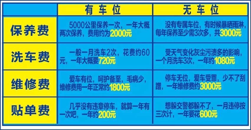 以某小區(qū)車位為例:購買車位費用8萬元,每月交40元的車位管理費,30年管理費累計1.44萬元。共計8萬+1.44萬=9.44萬元。平均1年的費用=9.44萬元/30年=3147元。 如果租車位,小區(qū)車位每月120元租金,按每5年月停車租金上漲100元算,共計(120+220+320+420+520+620)×12×5=13.32萬元。平均1年費用=13.32萬元/30年=4440元。