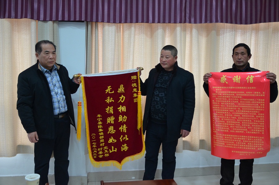 2017年2月3日下午,阜寧縣陳集鎮(zhèn)郝周村黨支部周書記及村委會董會計(jì)一行將“鼎力相助情四海,無私捐贈(zèng)恩如山”的錦旗和一封數(shù)百字的感謝信送到了江蘇德惠集團(tuán),言辭之中流露出他們對德惠集團(tuán)朱文亮董事長及全體工會成員對郝周村夏德亮、夏延康父子倆援助之手表示感謝之情。