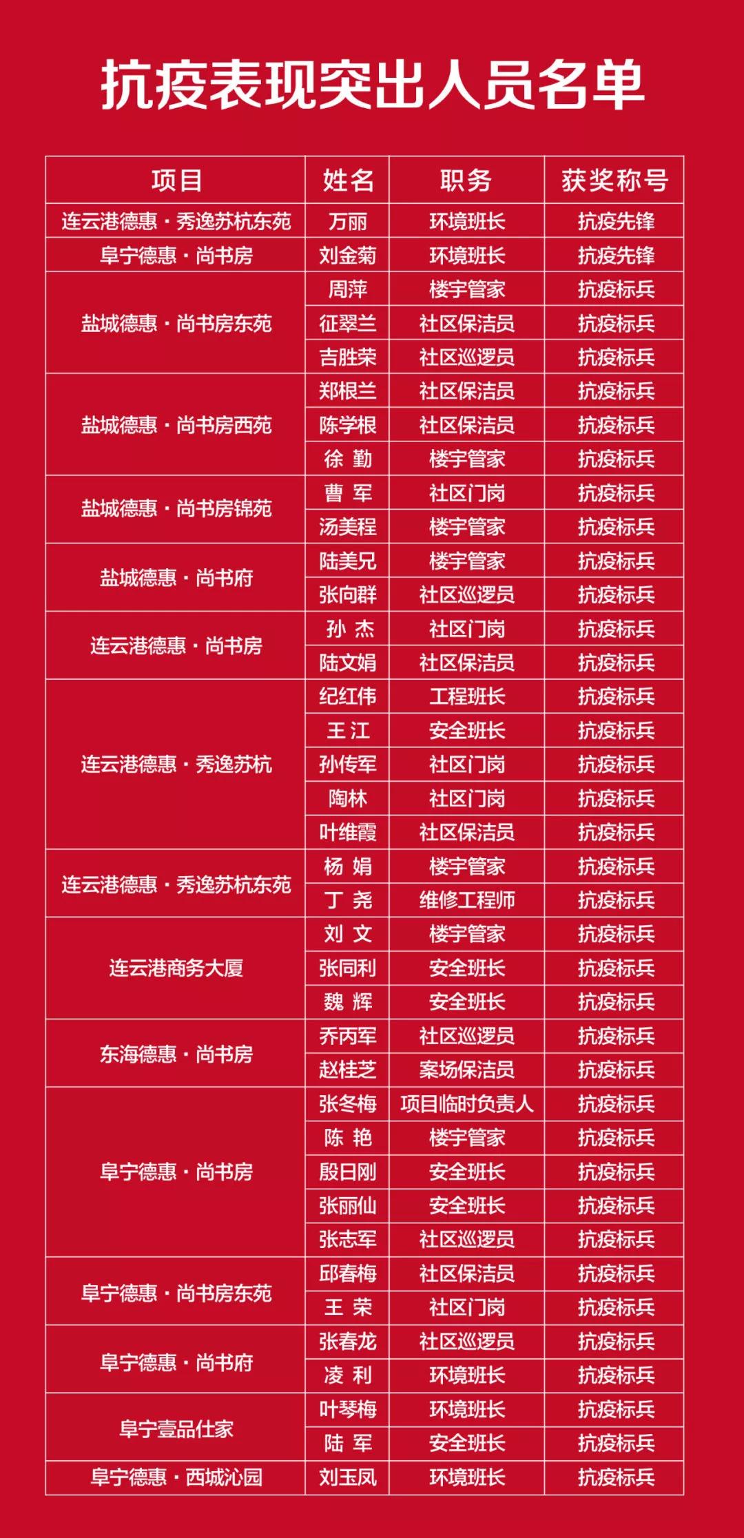 為更好地凝聚德惠物業(yè)及客服伙伴的力量,弘揚(yáng)德惠物業(yè)及客服伙伴奮勇前行的精神,激發(fā)全體員工迎難而上、共克時(shí)艱的昂揚(yáng)斗志,8月中旬德惠集團(tuán)各區(qū)域項(xiàng)目召開(kāi)了疫情防控表彰大會(huì),通過(guò)各物業(yè)項(xiàng)目?jī)?nèi)部推薦及城運(yùn)集團(tuán)綜合評(píng)估,評(píng)定出在疫情期間表現(xiàn)突出的員工:“抗疫先鋒”2名,獎(jiǎng)勵(lì)2000元/人;“抗疫標(biāo)兵”共計(jì)36名,獎(jiǎng)勵(lì)500元/人;同時(shí)對(duì)于2-3月份能堅(jiān)守崗位的德惠物業(yè)及客服伙伴,發(fā)放特殊崗位津貼200元/人。 在此,德惠集團(tuán)及全體伙伴,向你們?cè)谝咔槠陂g的辛勤付出表示衷心的感謝,對(duì)你們的奉獻(xiàn)精神表示最崇高的敬意! 德惠集團(tuán)以你們?yōu)轵湴粒蚰銈冎戮矗?/span> 祝健康平安、闔家幸福! |