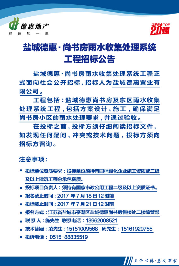 鹽城德惠•尚書房雨水收集處理系統(tǒng)工程招標公告